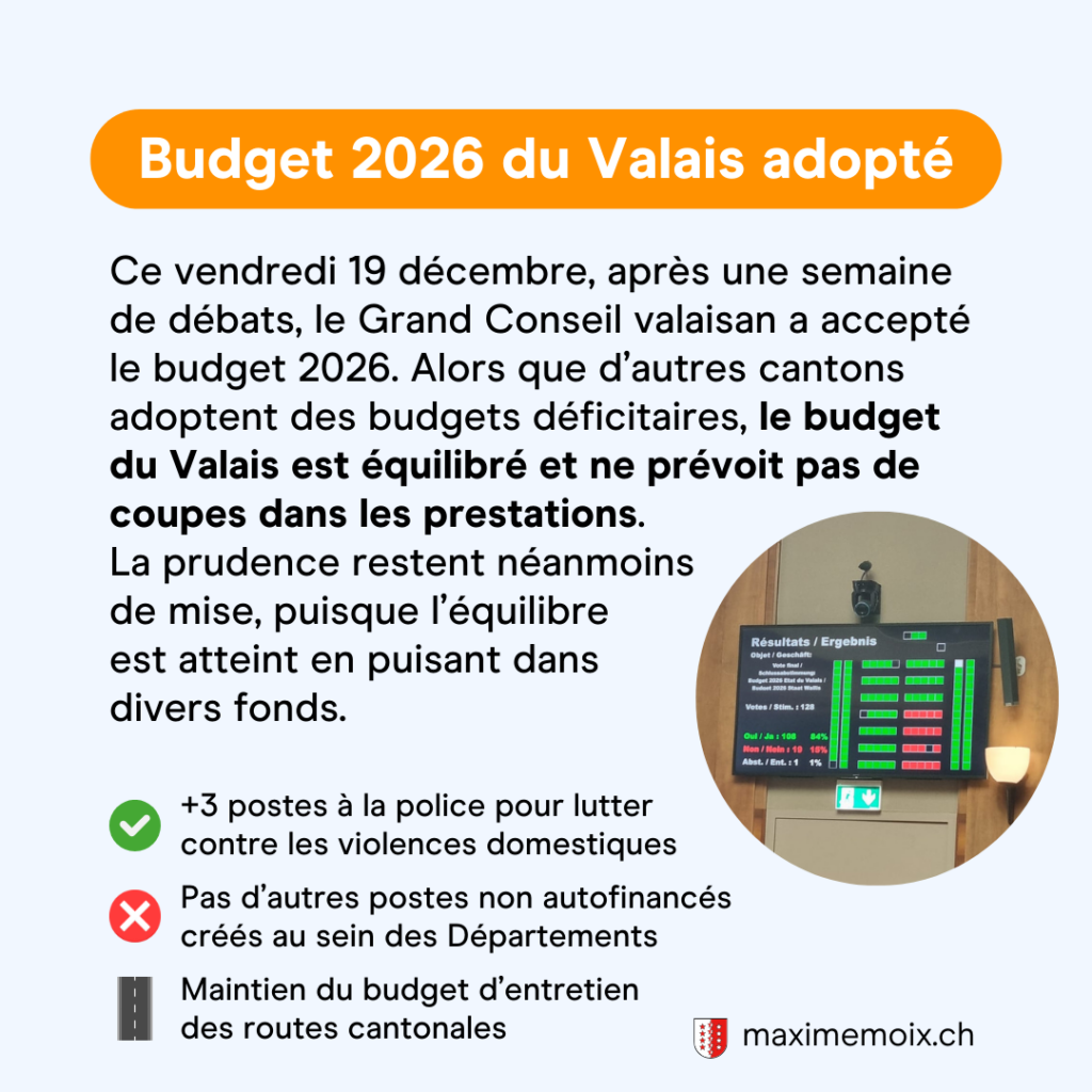 De mon côté, il s’agit de mon premier exercice en tant que membre de la commission des finances du Grand Conseil. Le vote final sur le budget marque ainsi l’aboutissement de plusieurs mois de travail consacrés à l’examen des projets de budget des 57 services et entités de l’État du Valais. Il est temps de ranger les dossiers pour quelques jours: bonnes fêtes! 🎄