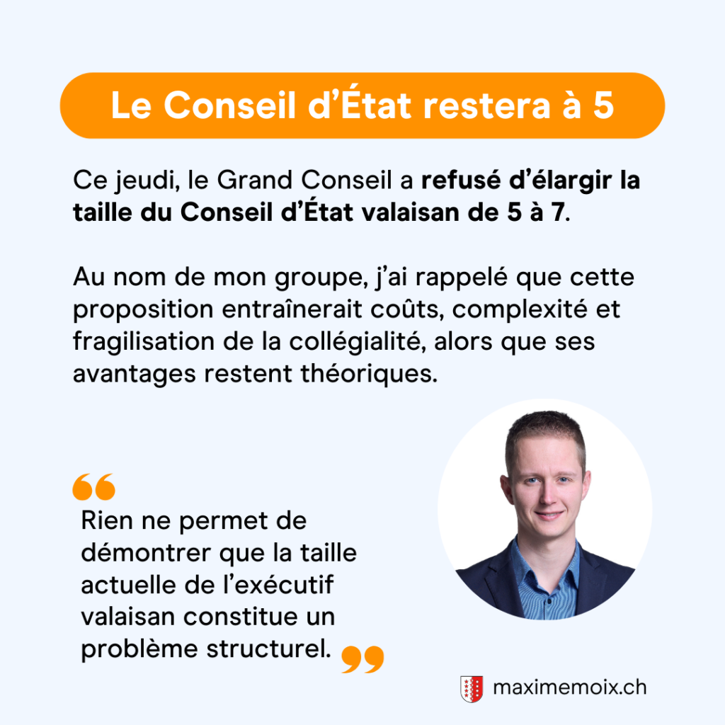 Le Grand Conseil valaisan a terminé sa session de mars, avec la révision de la loi sur la culture. Le jeudi 12 mars, il a aussi revu les modalités d’élection du Conseil d’État: il souhaite introduire une bulletin unique et supprimer la règle des districts. Il a en revanche refusé d’augmenter la taille du gouvernement à 7. Une proposition que j’ai d’ailleurs combattue au nom de mon groupe Le Centre Valais romand.